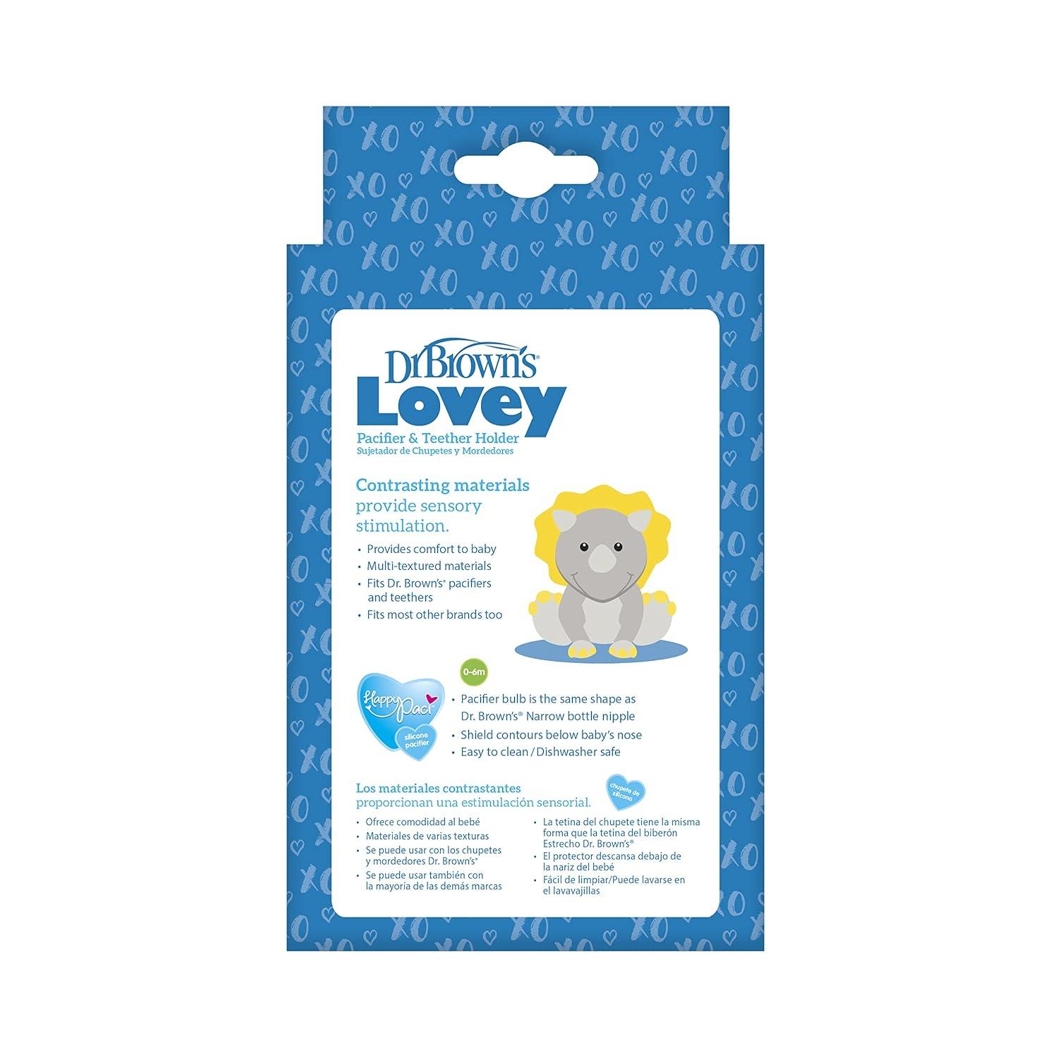 The best things in life are made with Lovey! Dr. Brown's Lovey Pacifier and Teether Holder is the perfect companion for your little one's self-soothing journey. This adorable Lovey is designed to keep pacifiers and teethers close by, so your baby can effortlessly soothe themselves when needed. With cuddly, multi-textured fabrics for a tactile experience and a sturdy design that holds up to the wear and tear of a well-loved toy, it is the ultimate baby essential. Each Lovey comes with a Dr. Brown’s 100% silicone HappyPaci pacifier, shaped just like Dr. Brown’s bottle nipples for easy acceptance and a happy baby! Loop attachments on both Lovey arms means two options for baby – making it easier for little hands to find, grip, and self-soothe. Secure loops ensure removable pacifiers and teethers won’t fall off and get lost. The Lovey holds any of Dr. Brown's pacifiers and teethers and most other brands. The Lovey is machine washable and the HappyPaci pacifier is dishwasher (top rack) and sterilizer safe. BPA free.
