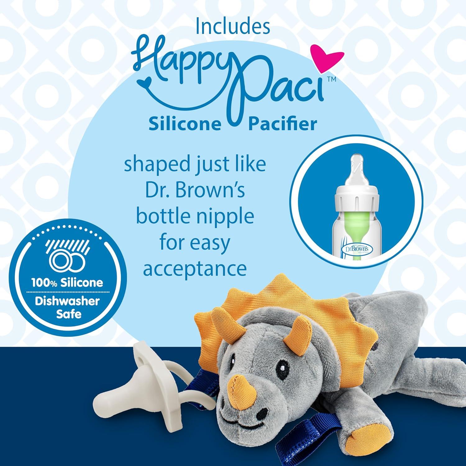 Dr. Brown’s Baby Lovey Pacifier and Teether Holder, Deer with Pink HappyPaci, 100% Silicone, 0-6m (Packaging May Vary)(Triceratops)