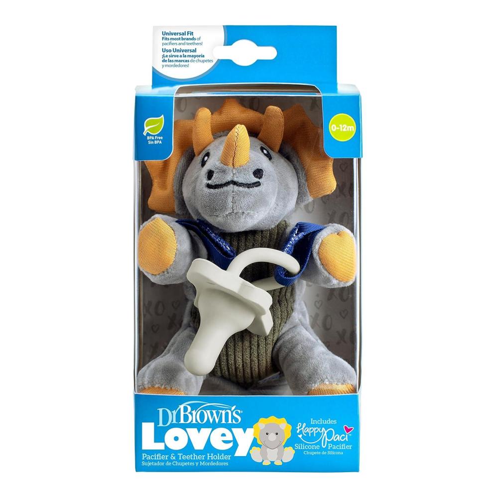 BABY PACIFIER and TEETHER HOLDER. Designed to keep baby’s pacis and teethers close by, the Lovey securely holds most pacifiers and teethers and includes a 100% silicone Dr. Brown’s HappyPaci pacifier.