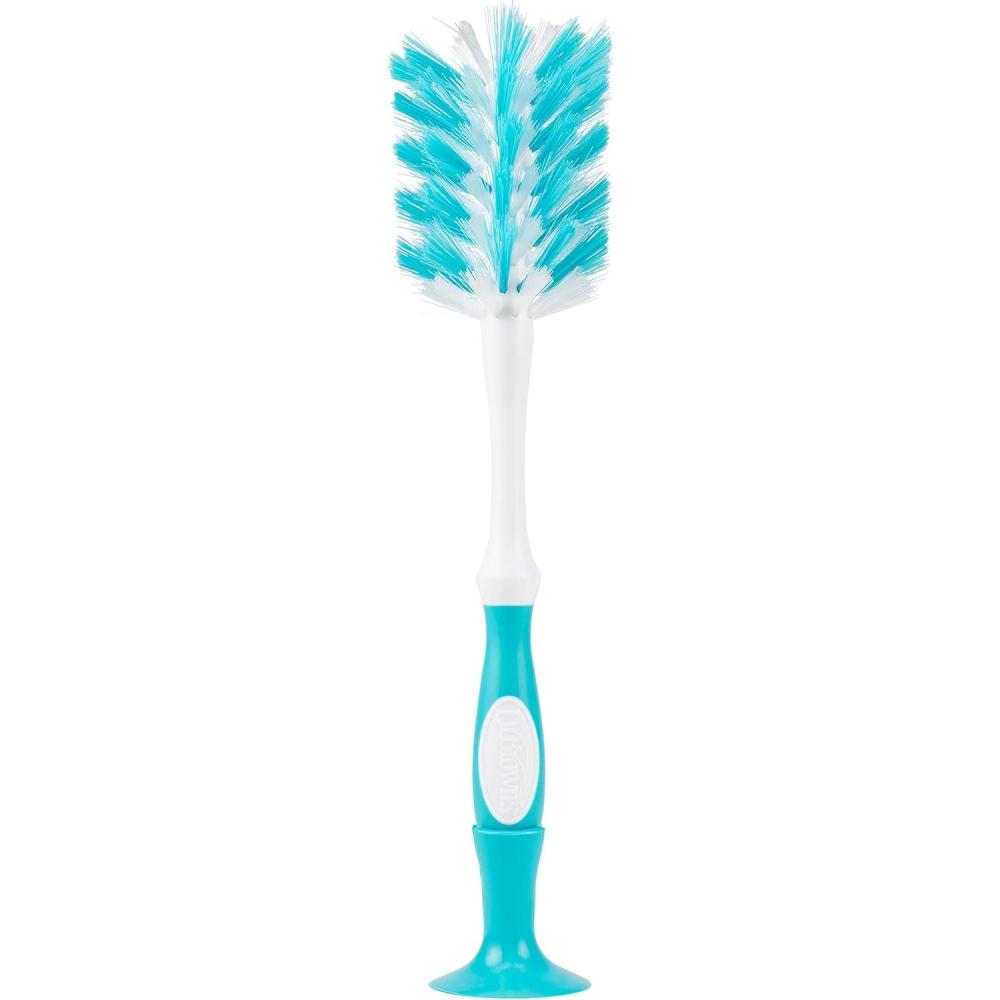 Cleaning bottles is a breeze with Dr. Brown's Deluxe Bottle Brush. The soft yet sturdy bristles are angled to help prevent splashing and to thoroughly clean every corner of baby bottles, sippy cups, and more. The Deluxe Bottle Brush offers two ways to clean – the brush head cleans the entire bottle, and the ridged nipple cleaner on the base is designed to quickly and easily clean bottle nipples. The no-slip handle is comfortable and easy to hold and long enough to reach all the way into bottles and sippy cups. Use the suction cup base for convenient and hygienic sink-side storage. Plus, the Deluxe Bottle Brush comes with a bonus small parts brush to clean vent inserts, reservoirs, and other hard-to-reach areas. BPA Free.